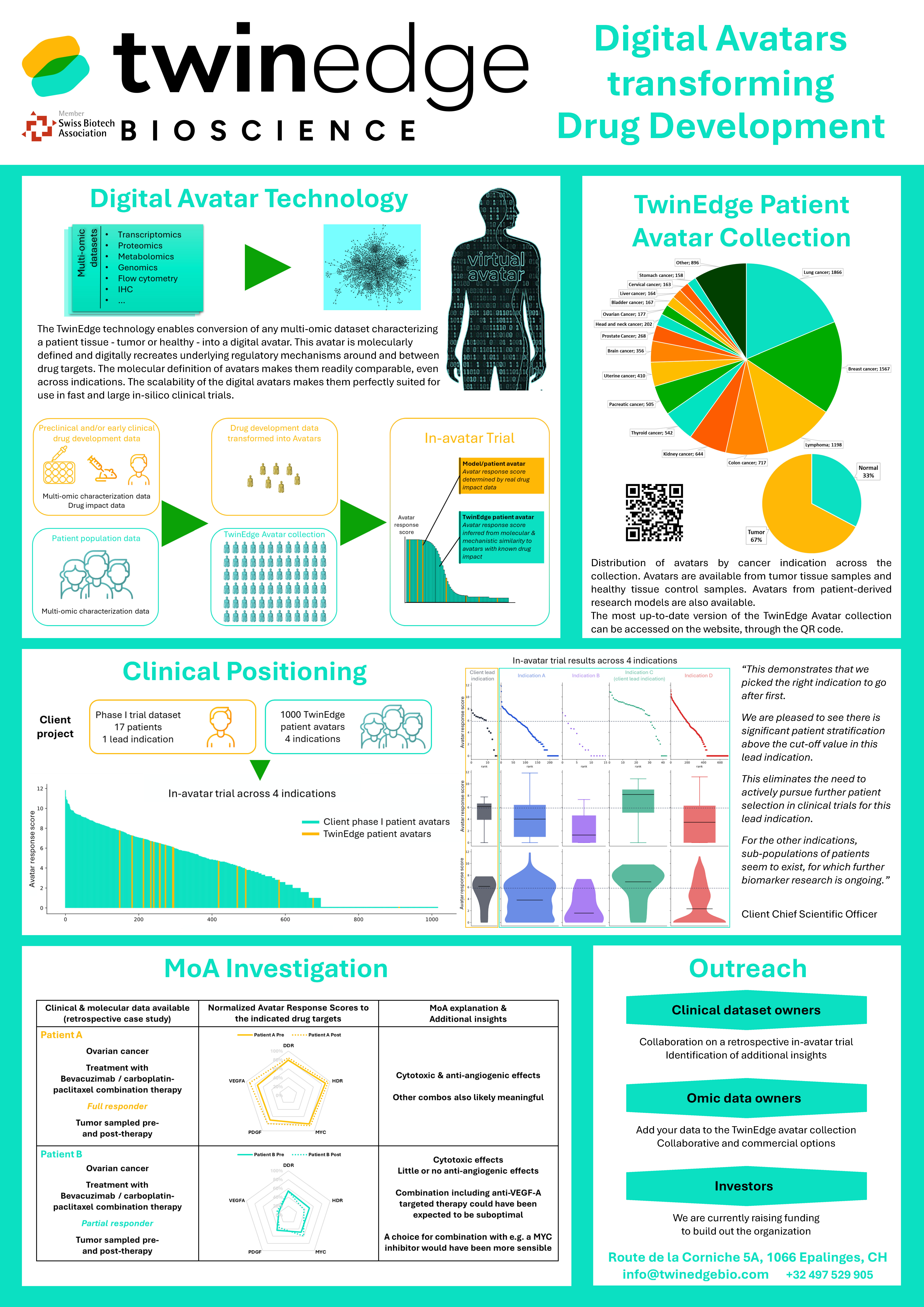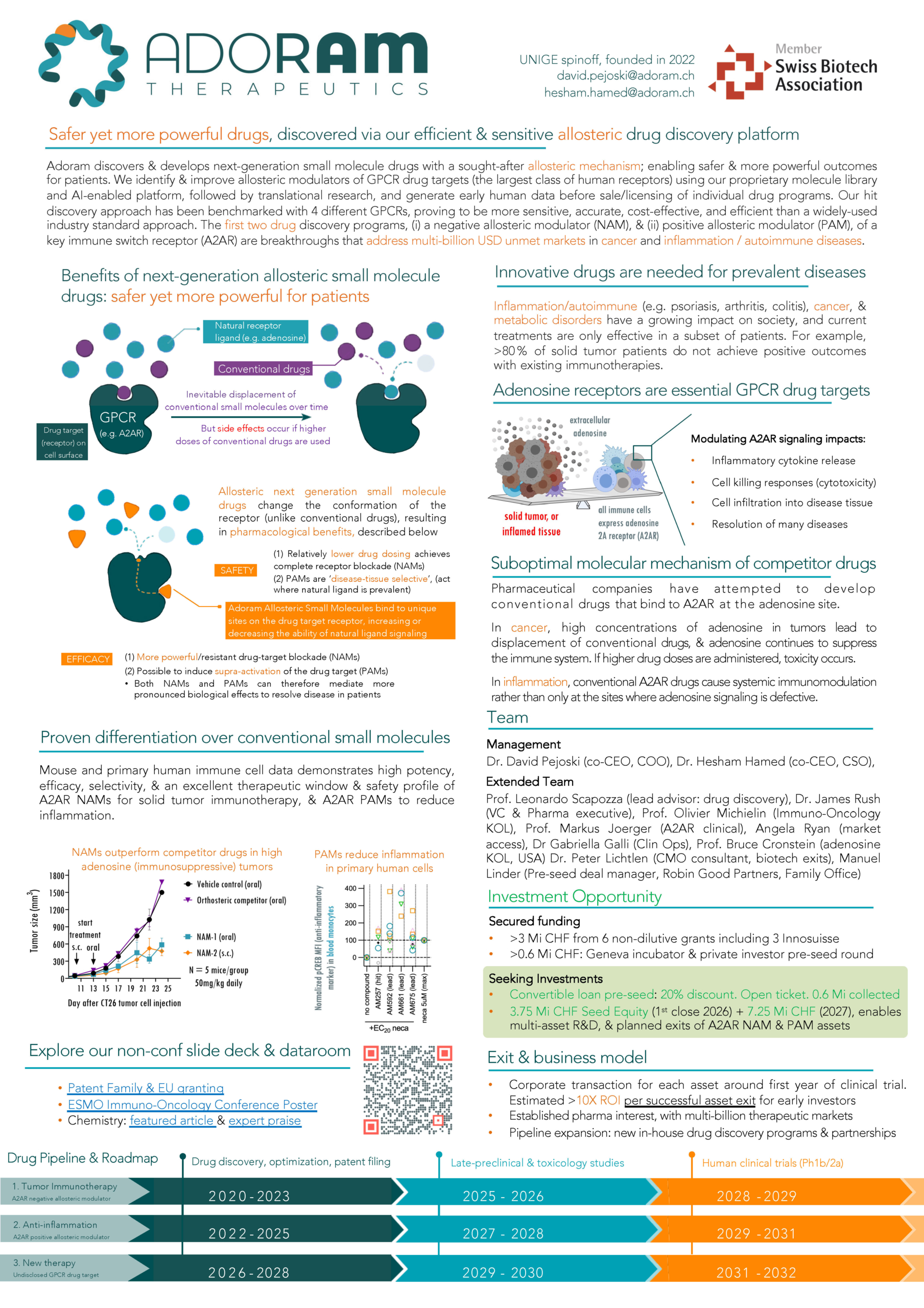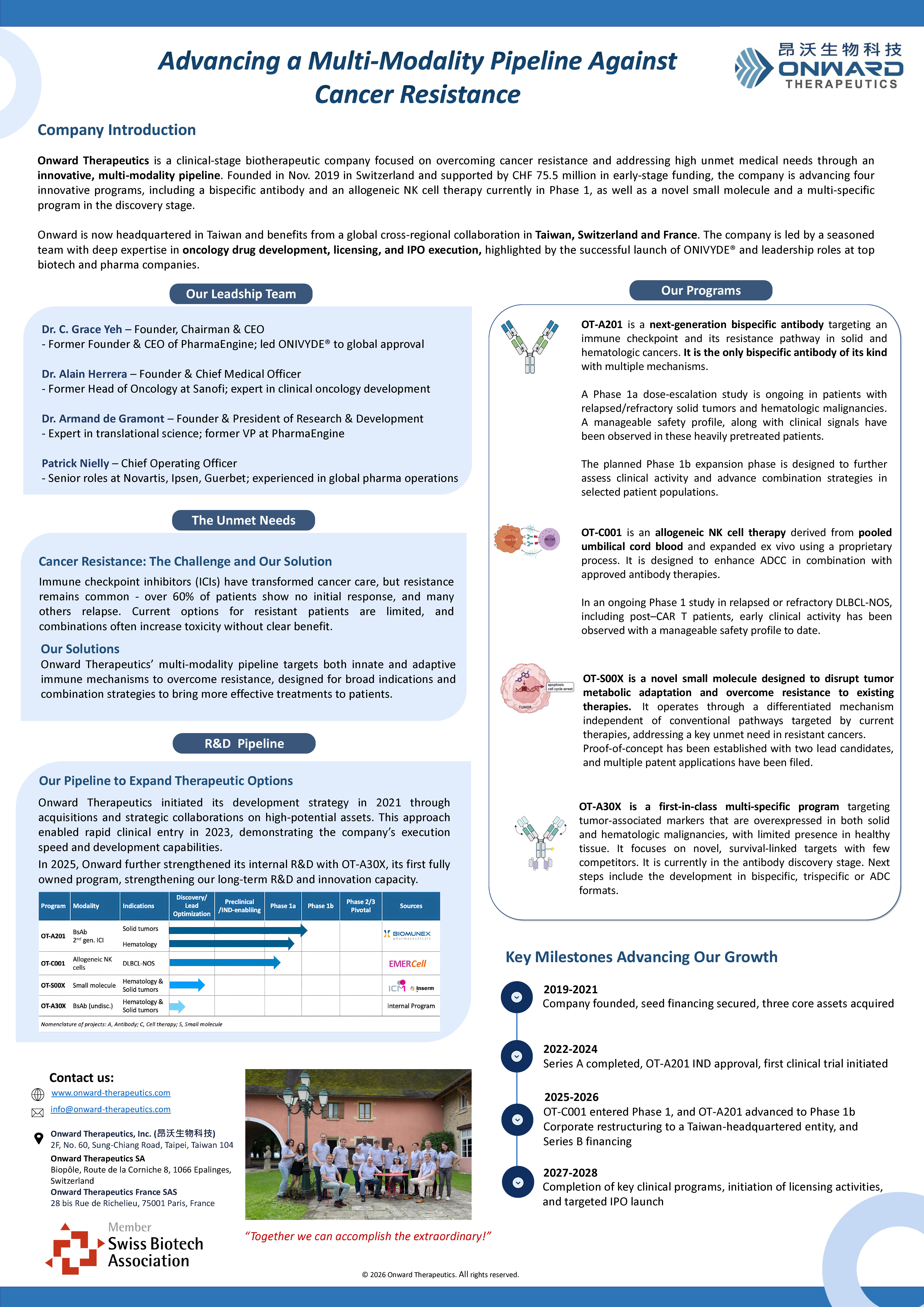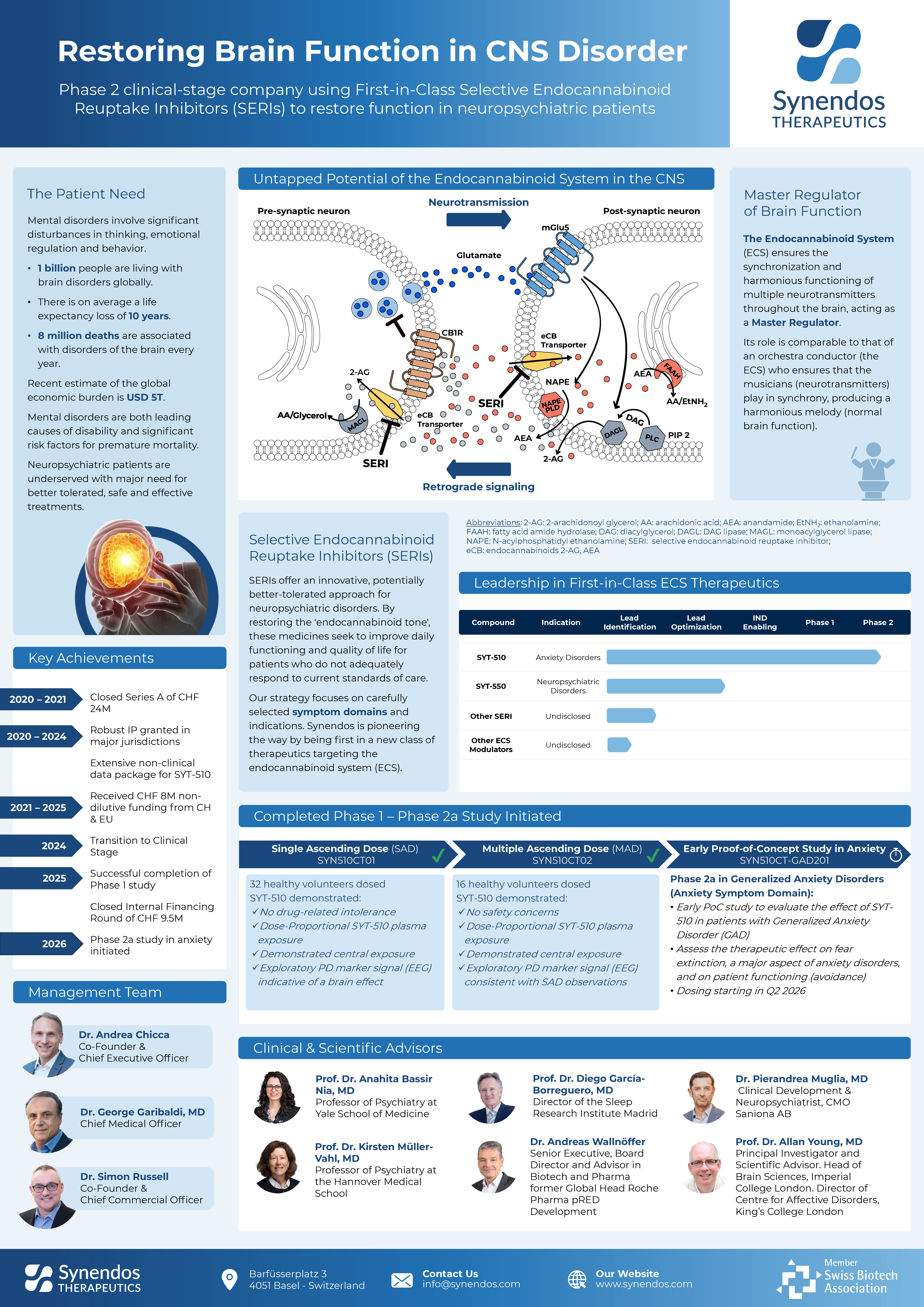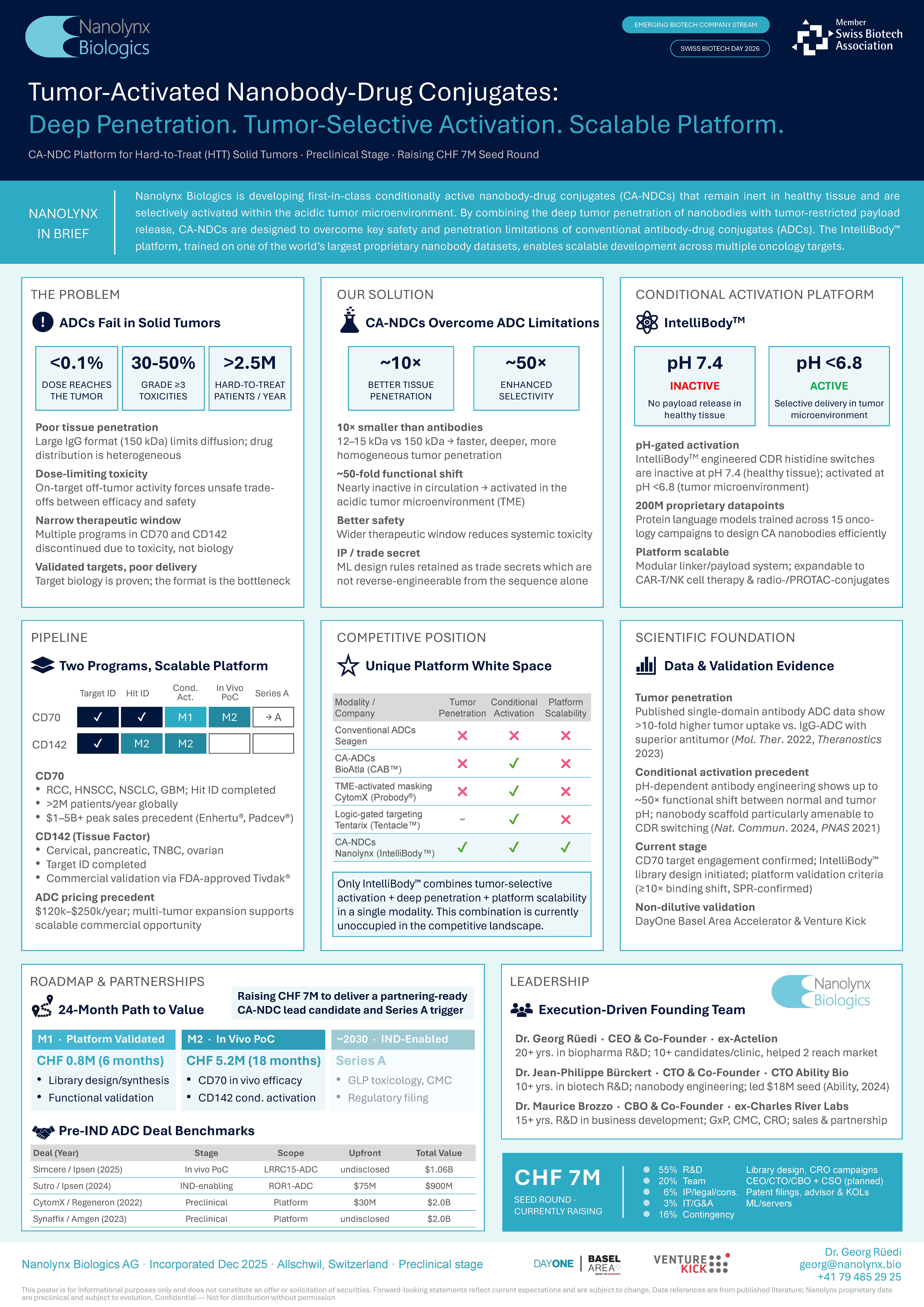 Below are 3 sample posters from Swiss R&D biotech companies, highlighting their innovation, expertise, and the strength of the Swiss biotech ecosystem. A dedicated 45‑minute poster session will take place each day (May 4: 16:15-17:00; May 5: 14:45-15:30) to showcase all submitted posters.